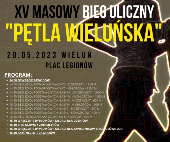 W dniu 20.05.2023 r. w centrum Wielunia zorganizowany został XV bieg uliczny „Pętla Wieluńska”. Bieg podzielony został na kategorie wiekowe: przedszkolaki, klasy I-III, IV-VI, i VII-VIII szkół podstawowych oraz szkoły ponadpodstawowe. Ostatnią konkurencją był bieg główny na dystansie 2500 m w którym wystartowało 74 zawodników. Ogółem w zawodach startowało ponad 300 osób. Organizatorem zawodów był…